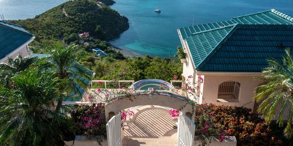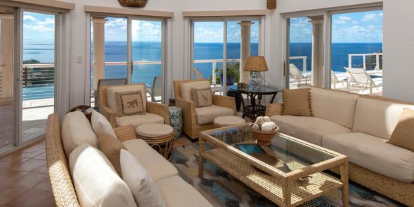 From the gorgeous pool and spa terrace that wraps the length of the villa, you’ll enjoy breathtaking 180-degree views to the east, south and west with your morning coffee or a happy hour cocktail. Sunbathing areas surrounding the sparkling pool, a covered outdoor dining and barbeque area and several lounge areas in both the shade and the sunshine ensure you’ll always have a fresh perspective on that incredible view! The lush, tropical landscape that surrounds Out of the Blue completes this luxurious island paradise.